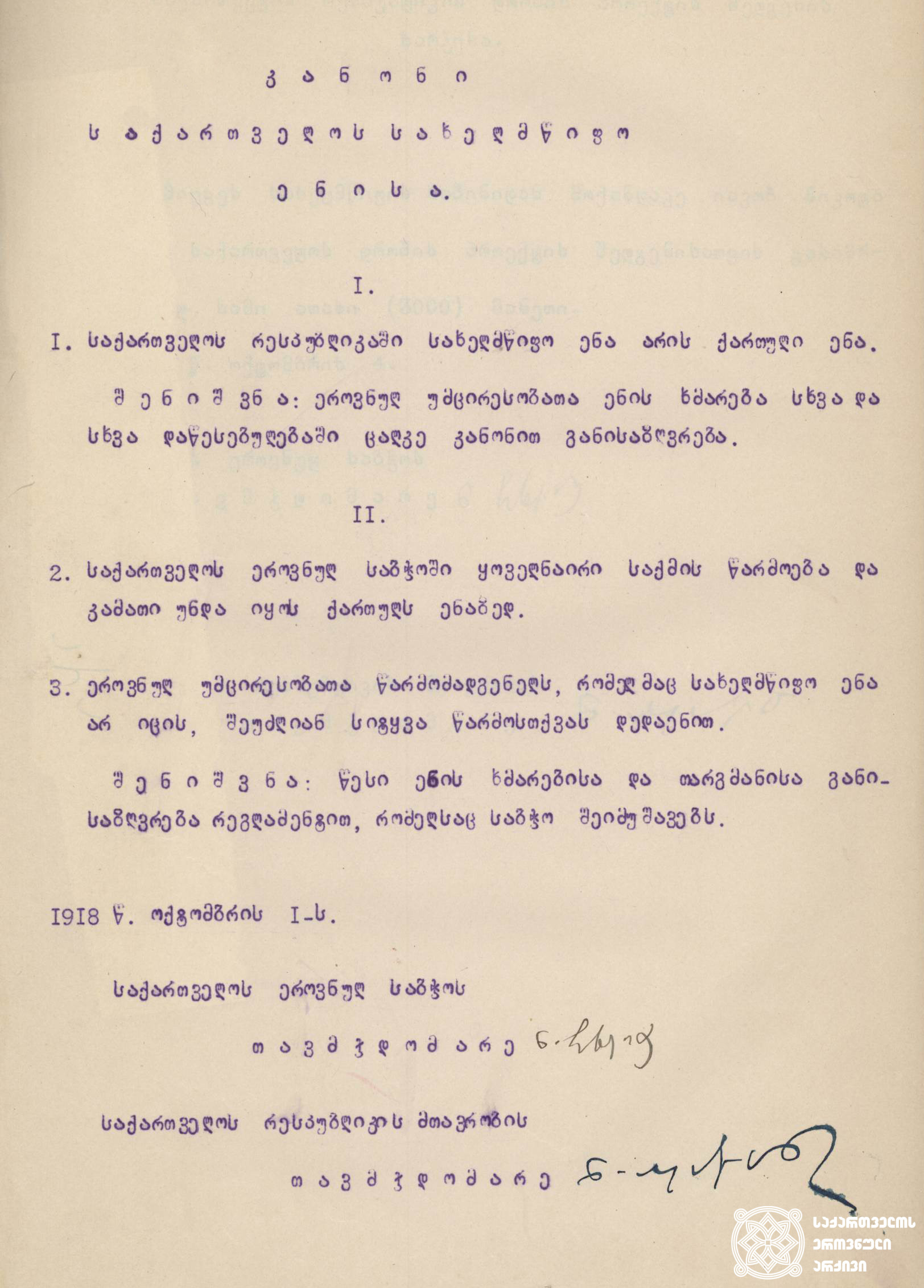 კანონი „საქართველოს სახელმწიფო ენისა", 1918 წლის 1 ოქტომბერი