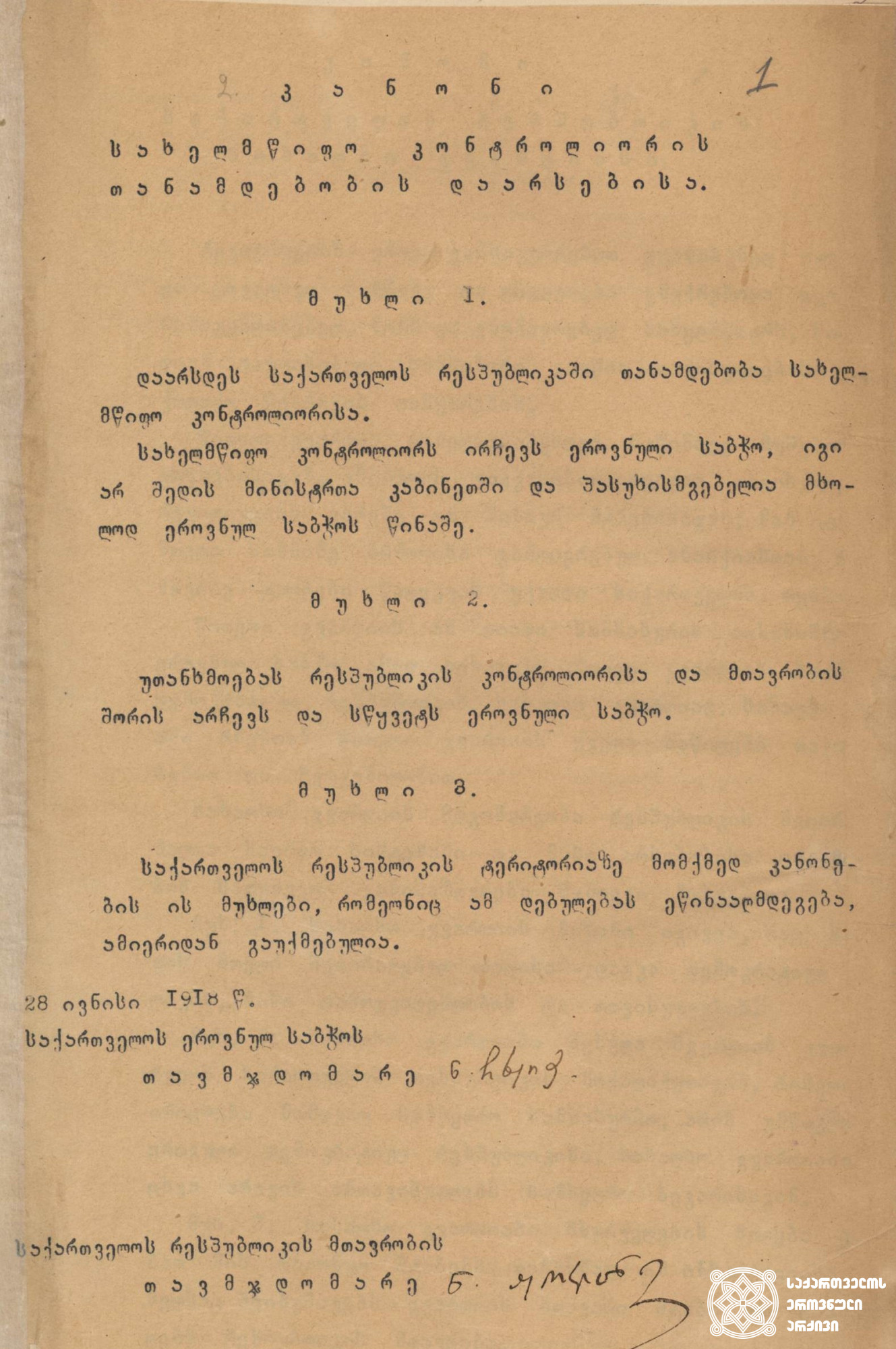 საქართველოს დემოკრატიული რესპუბლიკის ეროვნული საბჭოს მიერ მიღებული კანონი „სახელმწიფო კონტროლიორის თანამდებობის დაარსებისა“1918 წლის 28 ივნისი წყარო: ცენტრალური საისტორიო არქივი, ფონდი 1836, ანაწერი 1, საქმე 85